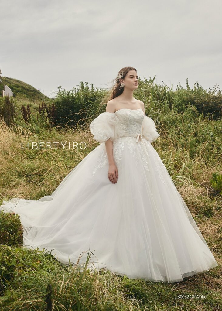 繊細なレースと軽やかなボリュームが、自然体の美しさを引き立てます!風景に溶け込む、ナチュラルで洗練されたウェディング。