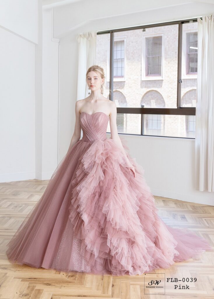 くすみピンクが、大人な可愛さを引き出す一着。立体感のあるチュールフリルが、華やかな存在感を演出します。スッキリとしたビスチェラインで、上半身は美しく。甘さの中に、上品さを感じるデザイン。写真映えも叶う、主役級カラードレスです!