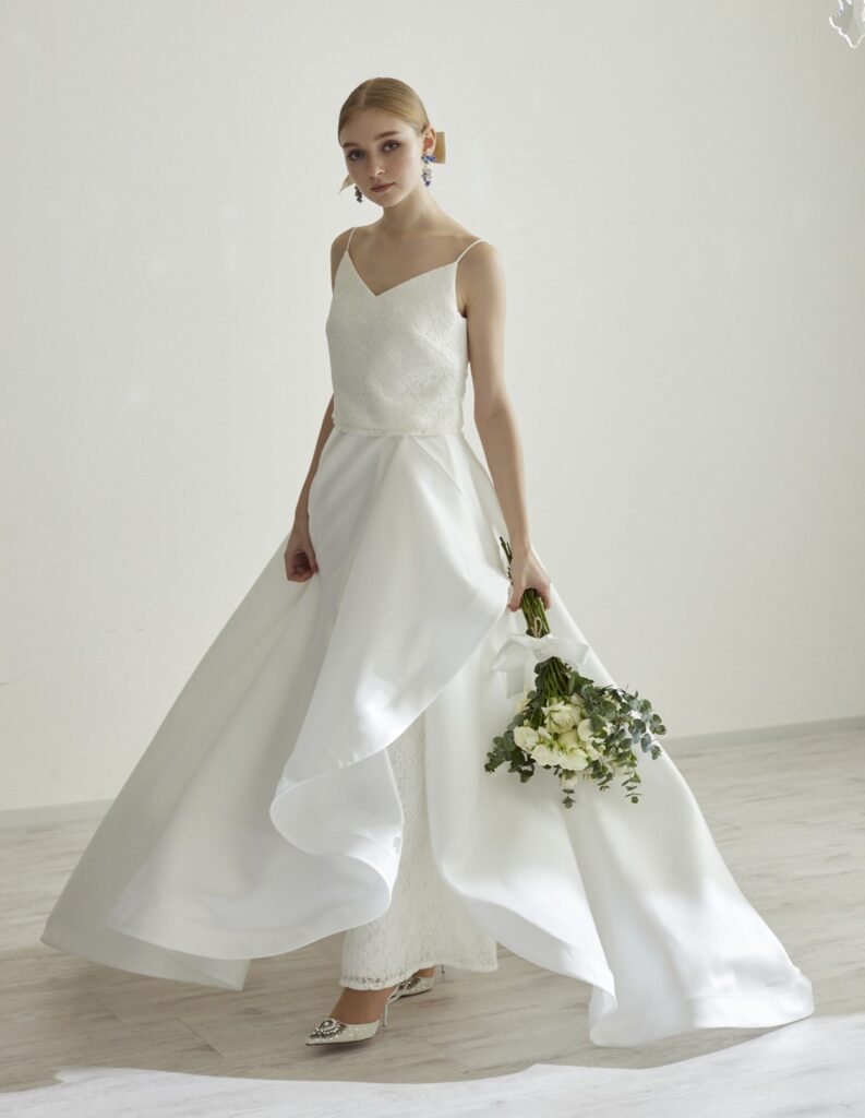 どのような姿にも美しく可愛らしくエレガントに変身できる【 LES F’EES couture 】のウェディングドレス。取り外し可能な、オバースカートは大胆なフリルのデザインで歩くたびに華やかさを感じさせます。ストラップビスチェでトレンド感のある一着は、リゾートウェディングやフォトウェディングなどにピッタリな一着です。