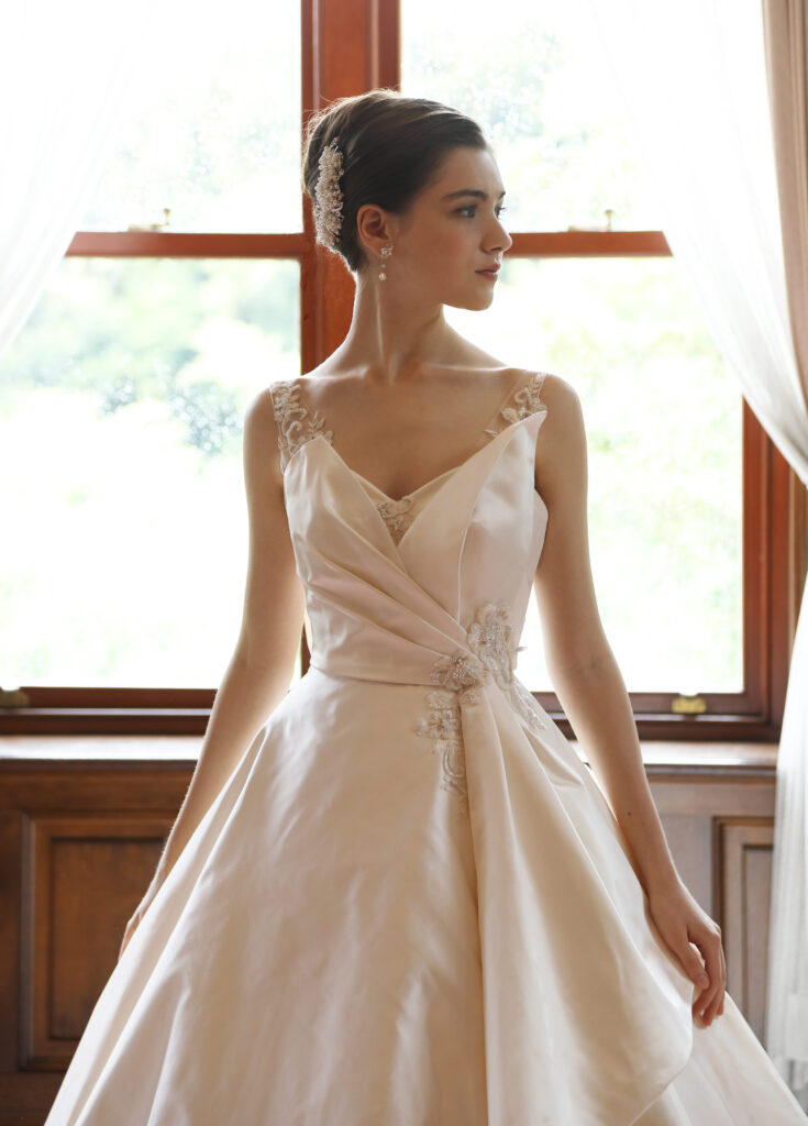 シルクサテンを贅沢に使用したウエディングドレスは、スッキリとしたVネックラインの胸元が女性の凛とした美しさを引き立たせてくれます。シンプルなデザインながら、大胆にカットされたバックスタイルと輝くパールビーズのショルダーを持つドレスは、お嬢様のセンスの良さを感じさせます。胸元のVラインサテンとバックスタイルのパールビーズは取り外し可能なので、お嬢様の個性に合わせてチョイスを楽しめます。
