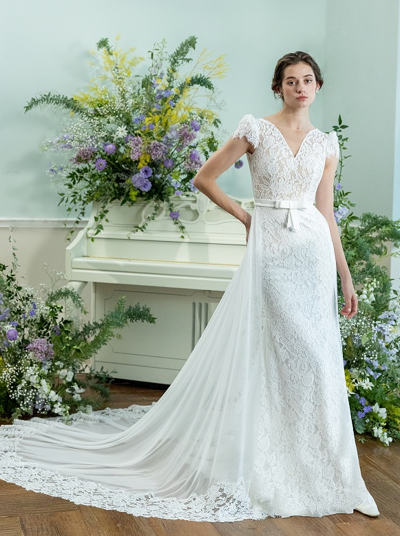繊細なレースが全身を彩るエレガントなマーメイドドレス。女性ならではの、しなやかなラインを美しく魅せてくれるのは素材と縫製にこだわったオートクチュールだからこそ。小さく膨らんだ個性的なスリーブが、ロマンティックとクラシカルのバランスを絶妙に表現しています。シルクジョーゼットのオーバースカートがゆったりと広がり、大聖堂にも映える圧巻のバックスタイルです。