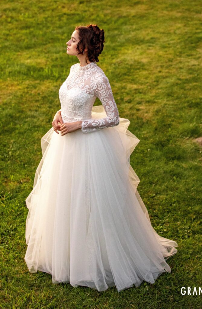 大胆かつ繊細なエンブロイダリーレースを上半身に施したドレスは、大切な結婚式を徹底的にこだわりたい花嫁にお届けしたい、オートクチュールブランド『グランマニエ』の傑作。ロングスリーブの繊細なレース、デザイン性のあるビーズ刺繍の美しさは、まさに芸術品。ヨーロッパの一流デザイナーが、女性の美しさを引き出すために考え抜き、それを職人技で縦糸のテンションを変えながら一針一針仕上げます。マーメイドラインだけでなく、付属のレースボレロやボリューム感あるスカートを組み合わせて、全く異なるスタイルもお楽しみいただけます。最高の一日にふさわしいドレッシーなドレスです。