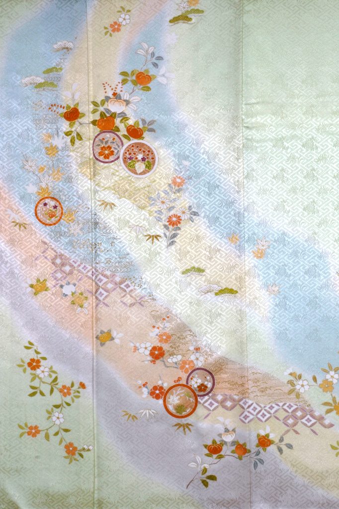 清涼感のある若草色の訪問着には、丸紋の中に桐や橘、梅の文様が描かれています。桐は鳳凰の住む木として尊ばれ、菊とともに皇室の紋とされてきた吉祥文様です。橘はみかんの仲間の一種。格調高い文様として留袖や振袖、訪問着などに用いられています。梅は「百花のさきがけ」というように、厳寒の中で香り高く咲きそめるので古来東洋では尊ばれてきました。桃色やレモン色が華やかで明るい印象に。柄もあまり大きくなく小柄な方でもきれいに着こなしていただけます。